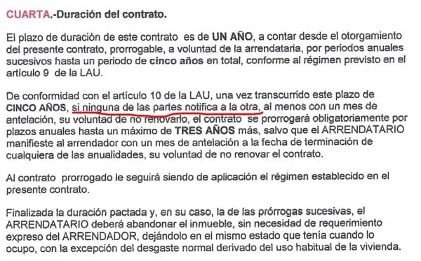 Vivo en una vivienda arrendada y este es mi séptimo año en la misma, esta a punto de terminar el mismo y el arrendador me ha enviado un correo electrónico informándome de que no se renovara nuevamente sin explicación alguna. He leído el contrato y según entiendo en la clausula cuarta (imagen) indica que si el arrendatario no avisa con un mes de antelación de la no renovación de el contrato, este se renovara de forma automática hasta llegar al final del octavo año, me gustaría si alguien me pudiese asesorar de si esto es así, o por el contrario tengo que abandonar la vivienda a la finalización del séptimo año al cual le queda poco más de un mes. Gracias anticipadas
