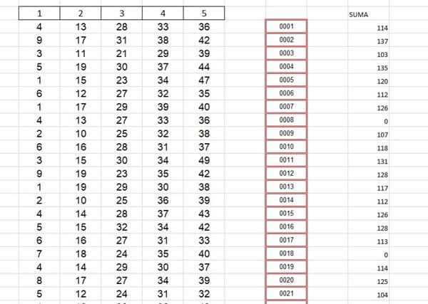 Las 5 columnas pero solo de los que la suma da 0 y también que numero le corresponde... Lo que esta en recuadro rojo.