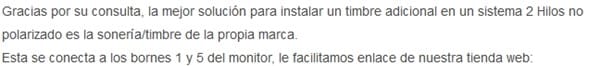La unidad interior tiene posibilidad de conectar otra unidad interior, ¿sería posible conectar en esa posición un timbre electrónico? ¿Existe alguna otra posibilidad?