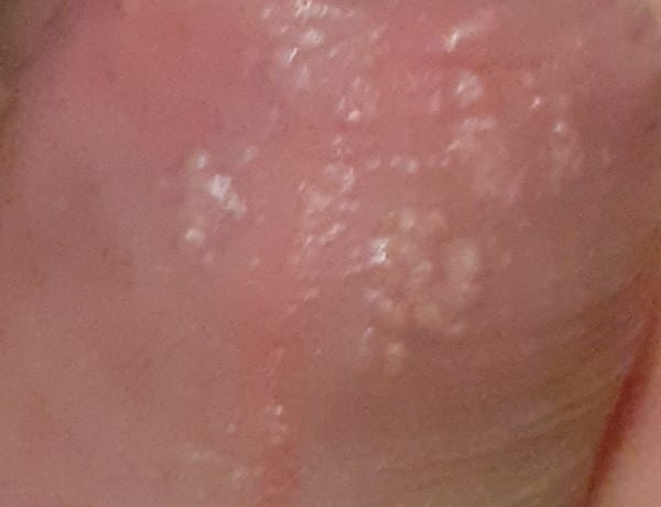 Lamento mi ignorancia y no poder atenderle mejor, sin embargo opino que parece ser fordyce, o al menos su descripción así me lo hace pensar. De todas formas si por favor le fuese posible, suba una captura de la zona para facilitar que le atiendan lo mejor posible. Puede hacerlo por ejemplo através de esta página,