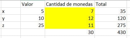 La alcancía de Miguel contiene monedas solamente de cinco, diez y veinticinco centavos. Hay 30 monedas en total, y su valor es 430 centavos. Dos veces el n número de monedas de 10 centavos, sumado al número de monedas de veinticinco centavos, es igual a cinco veces el número de monedas de cinco centavos. ¿Cuántas monedas de cada clase tiene en la alcancía?