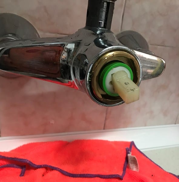 Quiero sacar el cartucho de este grifo de pared de cocina monomando, al quitar el tirador y embellecedor roscado me topo con este cartucho. El cartucho no tiene ninguna tuerca para desenroscar. Necesito sacarlo para limpiarlo ya que noto que hace unos días se nota más "duro" de lo normal al abrir el grifo. ¿Qué mecanismo tiene para sacarlo? Es marca tres.