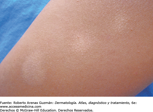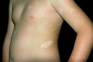 En un primer momento el niño presenta manchas redondas u ovalas de color pálido, blanquecino o rosado, tanto en la cara como en el cuello, brazos y en el torso y espalda. En ocasiones pueden tener cierto picor.