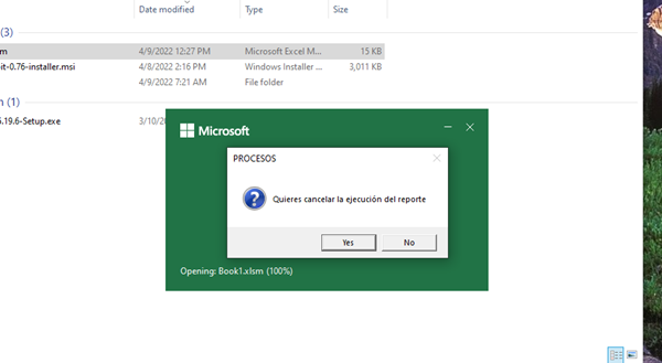 Sub prueba() Respuesta = MsgBox("Quieres cancelar la ejecución del reporte", vbYesNo + vbQuestion, "Cancelar reporte") tiempo = Application.Wait(Now + TimeValue("00:00:05")) DoEvents If Respuesta = 6 Then Exit Sub Else If tiempo = 0 Then Respuesta = 7 MsgBox "Listo" End If End If End Sub