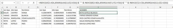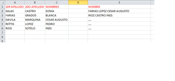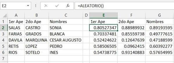 La columna E, podría formar 5 nombres aleatorios con los datos de A2:C6, sin que se repita nombres formados iguales, podría la función aleatorio hacer eso u otra función, es solo una curiosidad que tengo, como aleatorio haría esa búsqueda al azar...