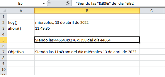 ="siendo las " & TEXTO(B3, "hh:mm AM/PM") & " del día " & TEXTO(B2, "[$-F800]dddd, mmmm dd, aaaa")