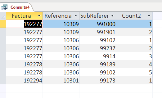 Cont2: (select count([Referencia])from[dbo_FaltantesSubItems] as temp WHERE [temp].[SubReferencia]<=[dbo_FaltantesSubItems].[SubReferencia] and [temp].[Referencia]=[dbo_FaltantesSubItems].[Referencia])