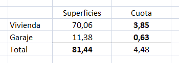 Ejemplo real de una vivienda de 70,06 m² con garaje anejo de 11,38 m² y que tiene en el Título Constitutivo una Cuota de Participación de 4,48: