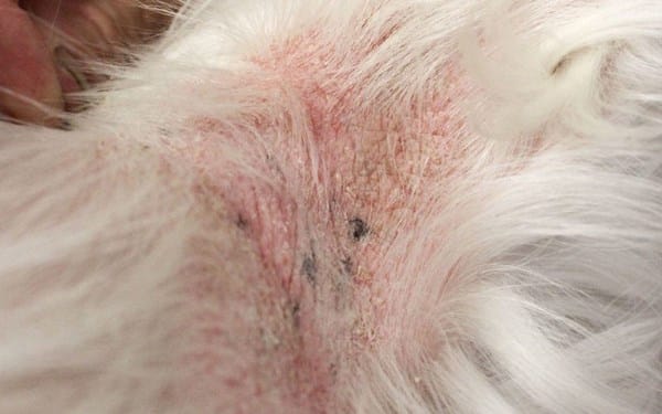 Ahora estamos notando que tiene caída de cabello, no es excesiva, pero revisándola ayer notamos que eran costras con mechones de cabello. No son grandes. No se rasca y tiene un comportamiento normal.