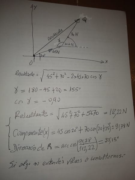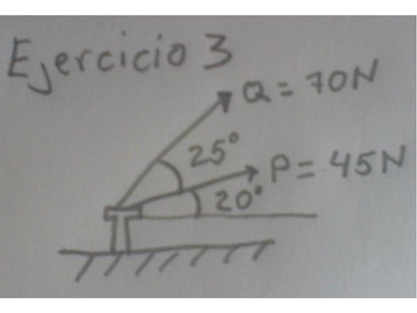 Las dos fuerzas P y Q actúan sobre el perno A. ¿Cúal es su resultante y su dirección aplicando el método del triángulo de forma trigonométrica?