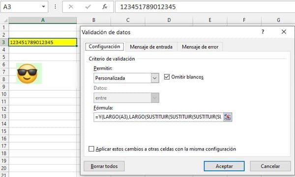 La presente es para que por favor configuren una fórmula “No una Macro” en Excel 2003 0 2007, solo permita una longitud de 15 caracteres Numéricos y no permita alfabéticos.