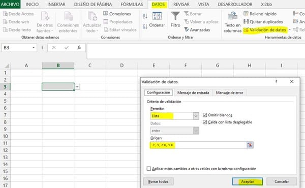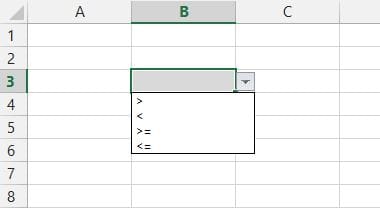 Me gustaría tener en una celda una lista con los siguientes operadores: >, <, >=, <= y que el usuario los pudiera elegir para poder comparar lo que quiera de otros dos valores ya dados.