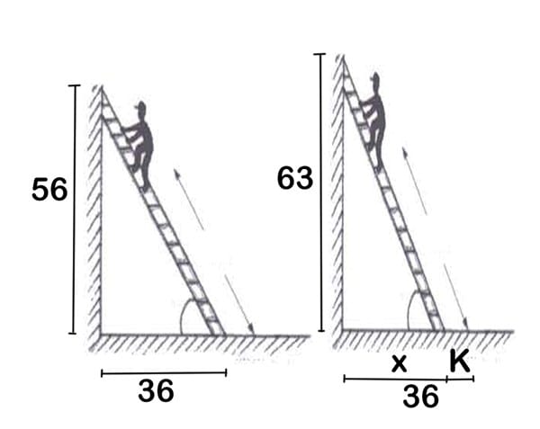 Un carpintero recostó una escalera contra una pared de 56 pues de altura. El pie de la escalera se encontraba separada de la pared a una distancia de 36 pies. Luego el carpintero decidió arrastrar la escalera k pies hacia la pared de forma tal que la pared alcanzara una altura esta vez de 63 pies. ¿Cuál sera el valor de k?. Redondea a la decena más cercana