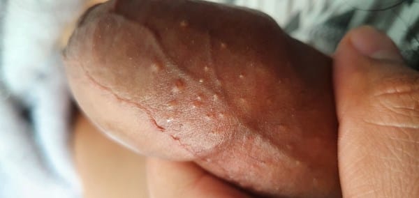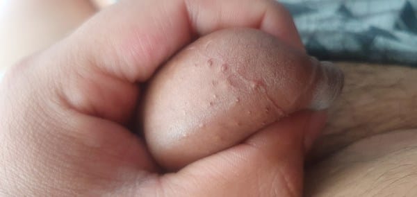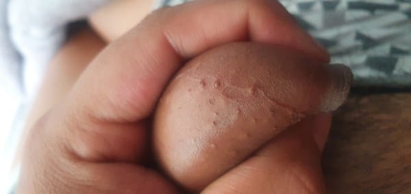 Lo que refiere podría ser los granos de fordyce o condilomas causados por el VPH. Los granos de Fordyce son unas glándulas sebáceas ectópicas que se manifiestan a través de la aparición de granos muy pequeños. Estos granitos suelen ser de color blanco, crema o amarillento y son completamente indoloros. Estos granos aparecen en la zona de los labios y la mucosa de la boca, así como en zonas íntimas como en la vulva en el caso de las mujeres y en el pene y el escroto en los hombres. Es importante tener en cuenta que aunque su aparición suele crear alarma, estos granitos no son ni infecciosos ni lesiones malignas y, de hecho, muchas veces ni siquiera requieren de un tratamiento.