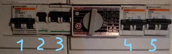 El caso es que me salta el interruptor 2 y 3 de los números que he puesto en la foto alguna vez de madrugada. Al principio me saltaba casi todas las noches, fui probando a quitar electrodomésticos de la cocina y quitando el microondas, dejo de suceder durante 2-3 semanas. El otro día probé a ver si funcionaba el lavavajillas, y bueno aparte de que no me mete agua al lavavajillas( que ese no es el caso xD) me a vuelto a empezar a ocurrir que me salta alguna noche otra vez. Ahora he probado a quitar la nevera, a ver si es eso, porque también al encenderla durante un rato se me enciende la luz de alarma y luego se va. También tengo que decir que en la vitro solo me funcionan 2 de los 4 fuegos que tiene, he comprobado que el interruptor numero 4 apaga las luces de la cocina y el 5 el del resto de la casa, y ninguno de esos dos salta. Así que bueno eso es lo que tengo y a ver si podríais ayudarme o saber por donde van las tiros antes de tener que llamar a un profesional.