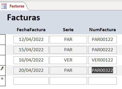 Me gustaría saber como puedo conseguir en Access que al hacer una factura me aparezca el numero automáticamente. Hago mis facturas con una SERIE + nº de factura + AÑO (solo los 2 últimos números). P.ej. PAR122