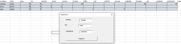 De acuerdo a seguir proyectándome para el conocimiento siempre he visto que los datos se guardan en una hoja insertando filas y los datos quedan en forma consecutiva ejemplo cod-nombre- tipo= A1, B1; C1---hasta allí completamente comprendido... Ahora me ha surgido una nueva pregunta si tengo de nuevo "A1, B1;C1, D1_____>Z1"y quiero grabar datos en la hoja no de manera consecutiva si no de acuredo al encabezado un ejemplo más claro una receta de cocina grabo "cod-nombre-tipo-ingrediente" los ingredientes de una receta pueden ser muchos y puede ir en la columna "X1" o M1 envío una imagen para ser más claro pues la verdad no se como hacerlo si crear una hoja temporal que guarde datos o hacerlo directo de acuerdo ala imagen serian muchos controles para registrar un dato especifico como lo puedo hacer donde digite nombre ingrediente y me grabe en la columna donde esta el nombre del ingrediente muchas gracias!