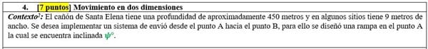 Contexto[1]: El cañón de Santa Elena tiene una profundidad de aproximadamente 450 metros y en algunos sitios tiene 9 metros de ancho. Se desea implementar un sistema de envió desde el punto A hacia el punto B, para ello se diseñó una rampa en el punto A la cual se encuentra inclinada .
