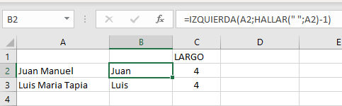 =IZQUIERDA(A2,BUSCAR(" ", A2))