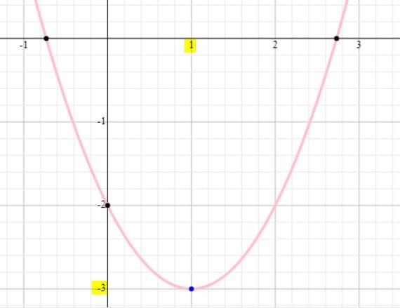 Me gustaría conocer el máximo, el mínimo y el rango para la siguiente parábola: y=x2-2x-2 cuando 0<=x<3.