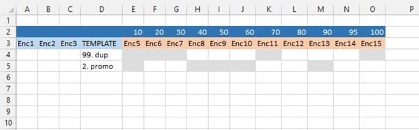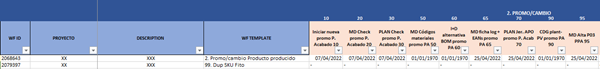 Como puedes comprobar, la primera fila tiene una template diferente a la segunda; lo que necesito es que dependiendo de la template que use, se desbloqueen los pasos que corresponden (ej: template 2 --> step 10,40,50,60,90 // template 99 --> step 10,20,30,70,100). Por otro lado, una vez conseguido esto, en las celdas habilitadas, necesito que de otra hoja me extraiga las fechas de finalización, utilizando el WF ID.