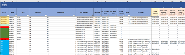 Esta es la vista principal del excel, aquí quiero que se vean reflejado los pasos por los que pasa el WF y si se ha finalizado el paso, me ponga una fecha de fin.