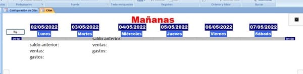 El formulario de la foto es de un ejemplo de un programa de citas, que se van pasando por semanas, lo que yo querría seria crear esas fechas y poner debajo unos campos de caja, de ventas y de gastos y recaudación y que vaya arrastrando cada día. NO se si me explicado.