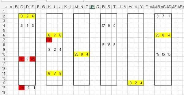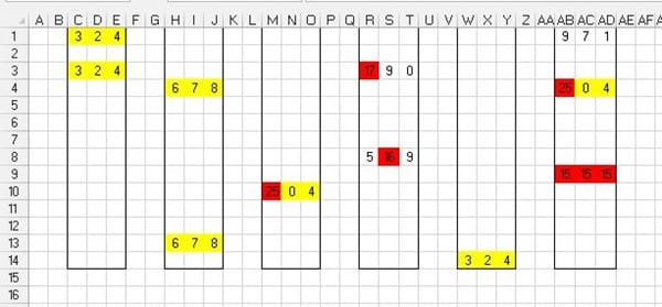 Entendiendo que los datos empiezan en la celda C1 y terminan en la columna AD. Que los datos de 3 números están en 3 columnas, separados por 2 columnas, luego 3 columnas y así sucesivamente, como se puede apreciar en la siguiente imagen: