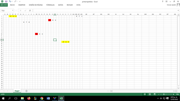 Como puedo colorear aquellos números que están repetidos en línea y además pintar en rojo aquellos números mayores de 10 en color rojo