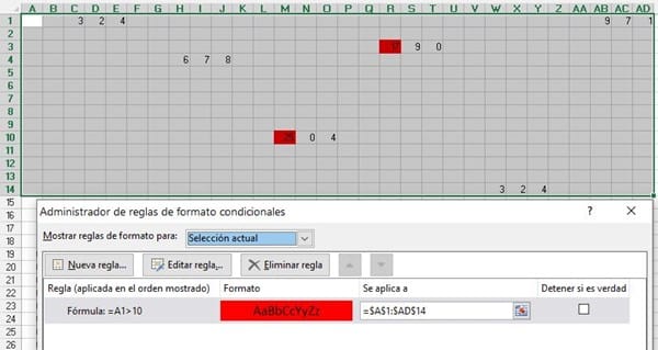 Si aplicas el siguiente formato condicional, puedes colorear de rojo los valores mayores a 10.