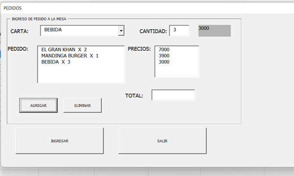LBOX_PEDIDO.AddItem CBOX_CARTA.Value & " X " & TBOX_CANTIDAD.Value & " = "