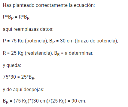 Calcular la longitud del brazo del peso para mover un peso de 25Kg aplicando una fuerza de 75Kg. El brazo de la fuerza tiene una longitud de 30cm: