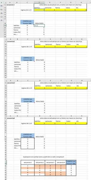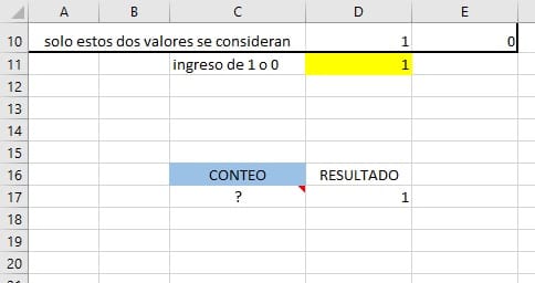 En este caso se considera 1 u 0 pero la idea es la misma contar el mismo valor hasta que salga uno diferente y el conteo empiece de nuevo, la celda D17 varia de acuerdo al ingreso de datos en D11