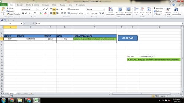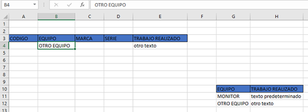 Con el código del equipo celda A4 al digitarlo me carga los datos de EQUIPO, MARCA, SERIE... Con el tipo de equipo que aparece ne la columna B me busca la rutina de mantenimiento de ese equipo y me sale en la columna E,, Esa rutina es generalmente por si no hay alguna anomalía y siempre sera la misma, pero en el caso de que necesite cambiar esa rutina la pueda sobre escribir y la pueda guardar sin problema, y cuando vuelva a escribir otro equipo que no presente anomalía me aparezca nuevamente el texto original predeterminado para no estar escribiendo para cada uno de los equipos que se van revisando..