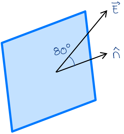 Un campo eléctrico uniforme E=5000 N/C que pasa a través de un plano cuya área es A=2m^2, forma un ángulo con la normal al plano de 80°. Determina el flujo eléctrico.