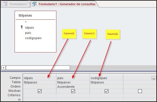 Observe que el SELECT consta de 3 columnas, idpais, pais, codigopais pero la "Columna dependiente" es la 1 (idpais), es decir sería por defecto el valor que toma el cuadro combinado, pero como quiero es el contenido del codigopais y NO es la columna dependiente para tomar este valor debo utilizar Column(indice), en donde indice es 0 para la primera columna 1 para la segunda y 2 para la tercera. Ver figura