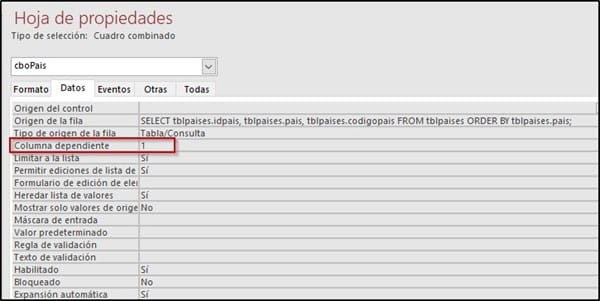 .- En el origen de datos del cuadro de lista eliminar el ID (quedaran dos columnas, COD_PAIS, NOMBRE_PAIS), será la primera la que contiene el dato que nos interesa.