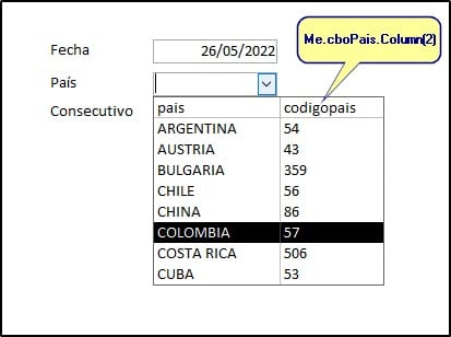 Private Sub cboPais_AfterUpdate() Me.ctlConsecutivo = siguiente(Me.cboPais.Column(2), Me.ctlFecha) End Sub