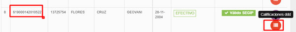 (Rectángulo rojo izquierdo, es el código que tiene cada estudiante como manera de identificarse, lo cual tengo en una lista de todos los estudiantes; el rectángulo pequeño es el botón que hago click y el cual como identificador tiene el código del estudiante señalado anteriormente)
