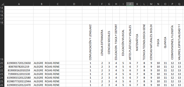 En el libro excel tengo ubicado en la hoja "sigep" y en el rango desde el "e20" hasta el "q20", para el primer estudinte