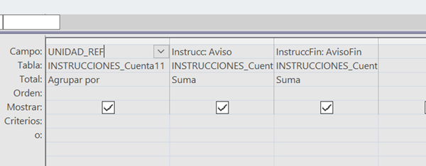He creado un campo de texto en un formulario y le he puesto este código en el origen de control de un formulario "=DBúsq("Instrucc","INSTRUCCIONES_Cuenta";"UNIDAD_REF=" & [me].[instrucc].[Valor])" lo que necesito y no me sale es que en dicho campo de texto me aparezca el valor existente en una consulta llamada INSTRUCCIONES_Cuenta y el campo a buscar se llama Instrucc, siendo el campo de relación UNIDAD_REF