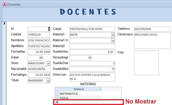 Estoy realizando un formulario de Docentes desearía que al mostrar los datos de un Docente mostrara las materias que imparte, estas previamente cargadas en otro formulario llamado MateriasDocente, he probado con un formulario continuo y no logro realizar lo deseado, si el docente no tiene materias asociados no debe mostrar ningún registro asociado. Acá le muestro el Formulario y como debería mostrar los registros, he probado con un Listado y no logro agarrar la idea, indíqueme cual sería la opción conveniente…Gracias