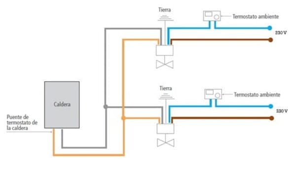 Tengo una caldera nameo de de dietrich, me vendieron 2 termostatos smart TC de la misma casa y mi idea era utilizar los 2 termostatos para gobernar 2 electroválvulas que tengo instaladas una en cada uno de los dos circuitos que tengo en casa (planta baja y primera planta), tipo del ejemplo.