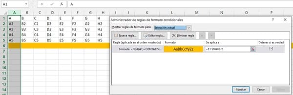 Pero, no puedo dejar de comentar que es una solución que utiliza innecesariamente recursos, tanto en asignar un formato a tooooooda la hoja (hasta celda XFD1048576), como además, colorear la fila entera.