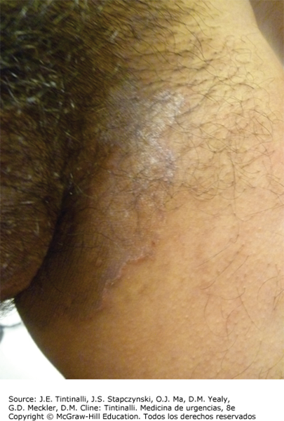 I. Hola Compañero, en mi caso no soy experto pero opino se asemeja a una descamación de la piel, producida quizás por un proceso de micosis (infección causada por hongos), en mi ignorancia he pensado que podría tratarse de un cuadro conocido como tiña inguinal, tiene este aspecto (no he logado encontrar una captura más cercana).