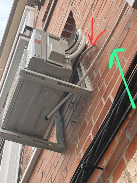 Como os muestro en la imagen, el tubo señalado en verde, está conectado a pluviales para no gotear a la calle y el tubo rojo ha empezado a gotear. El año pasado no goteaba nada, y tampoco recordamos si ese tubo en rojo estaba así, por eso no sabemos muy bien si ha sido a raíz de la obra en la fachada.
