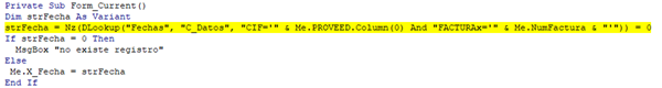 strPDF = DLookup("Fechas", "C_Datos", "CIF='" & Me.PROVEED.Column(0) & "' and FACTURAx='" & Me.NumFactura & "'")