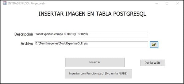 Utilizo este formulario para adicionar la imagen en la tabla (campo OLE en Access pero BLOB en SQL SERVER) hago clic en botón Insertar y se guarda la imagen, observe que también lo puedo hacer con una función de PostgreSQL y por medio de un link en la web. Ahora verifico que la imagen este registrada.