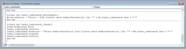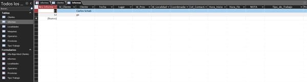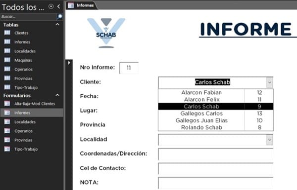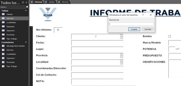 Una vez seleccionado el cliente en el cuadro combinado, el valor se guarda en el campo CLIENTE del formulario INFORMES.
