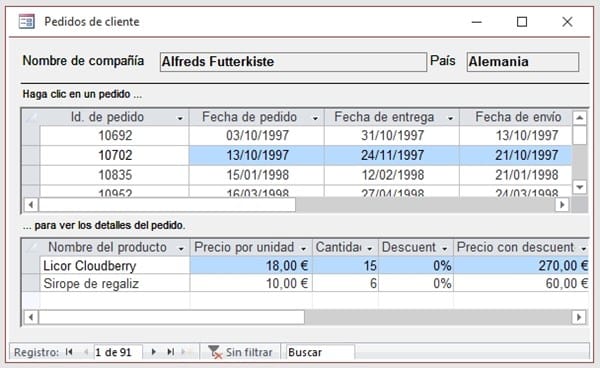 MS Access trae una BD de ejemplo y un formulario llamado "pedidos de cliente" (imagen adjunta), en el cual al hacer click en cualquier linea del formulario superior (id de pedido10702) actualiza los datos del formulario inferior, mostrando los detalles de ese pedido, por mucho que busque, no conseguí un evento, instrucción o macro que me diera la solución
